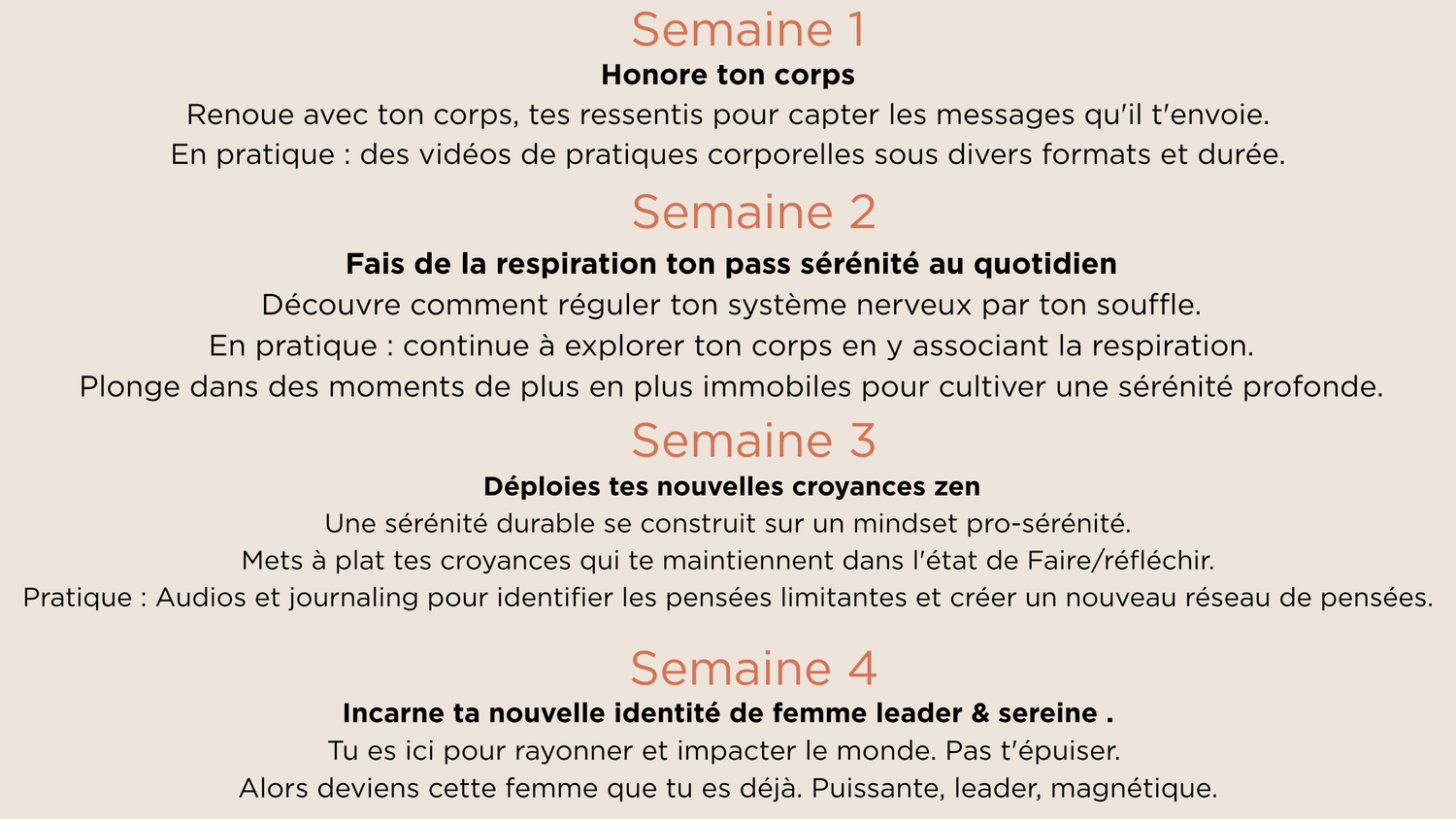 Tu suivras des pratiques de réveil corporels ou mouvements légers - pas de yoga comme tu peux en trouver en studio. Par contre oui, la sérénité passe d'abord par le corps. Bouger en conscience est ta 1ère étape.