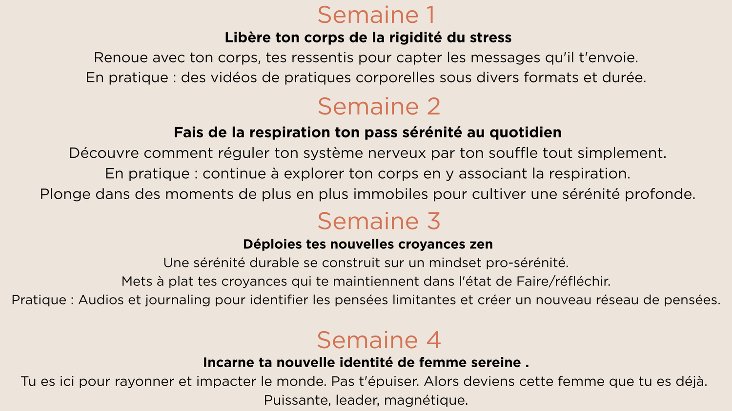 Tu suivras des pratiques de réveil corporels ou mouvements légers - pas de yoga comme tu peux en trouver en studio. Par contre oui, la sérénité passe d'abord par le corps. Bouger en conscience est ta 1ère étape.
